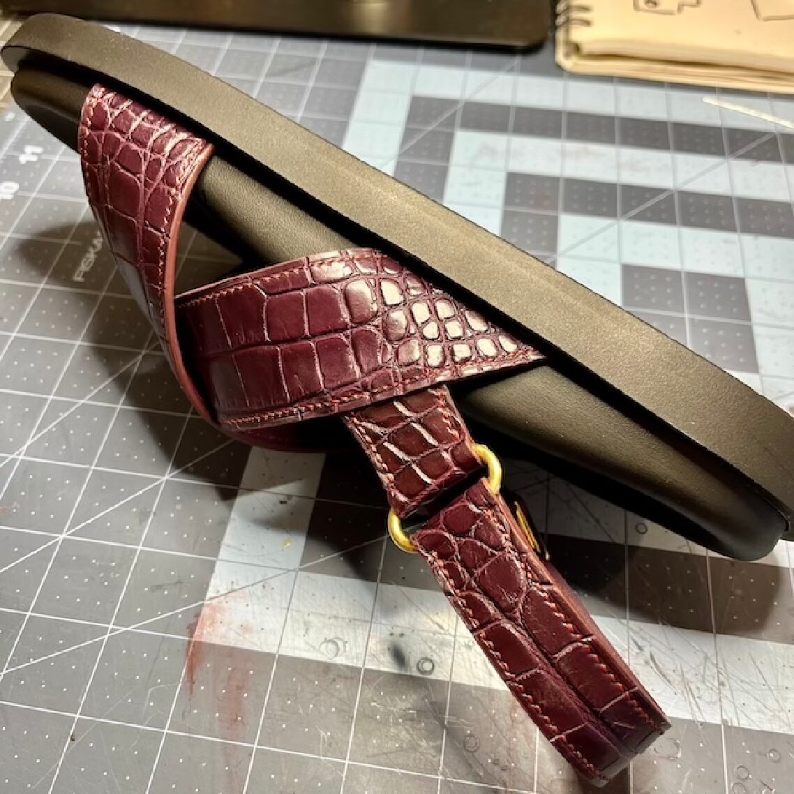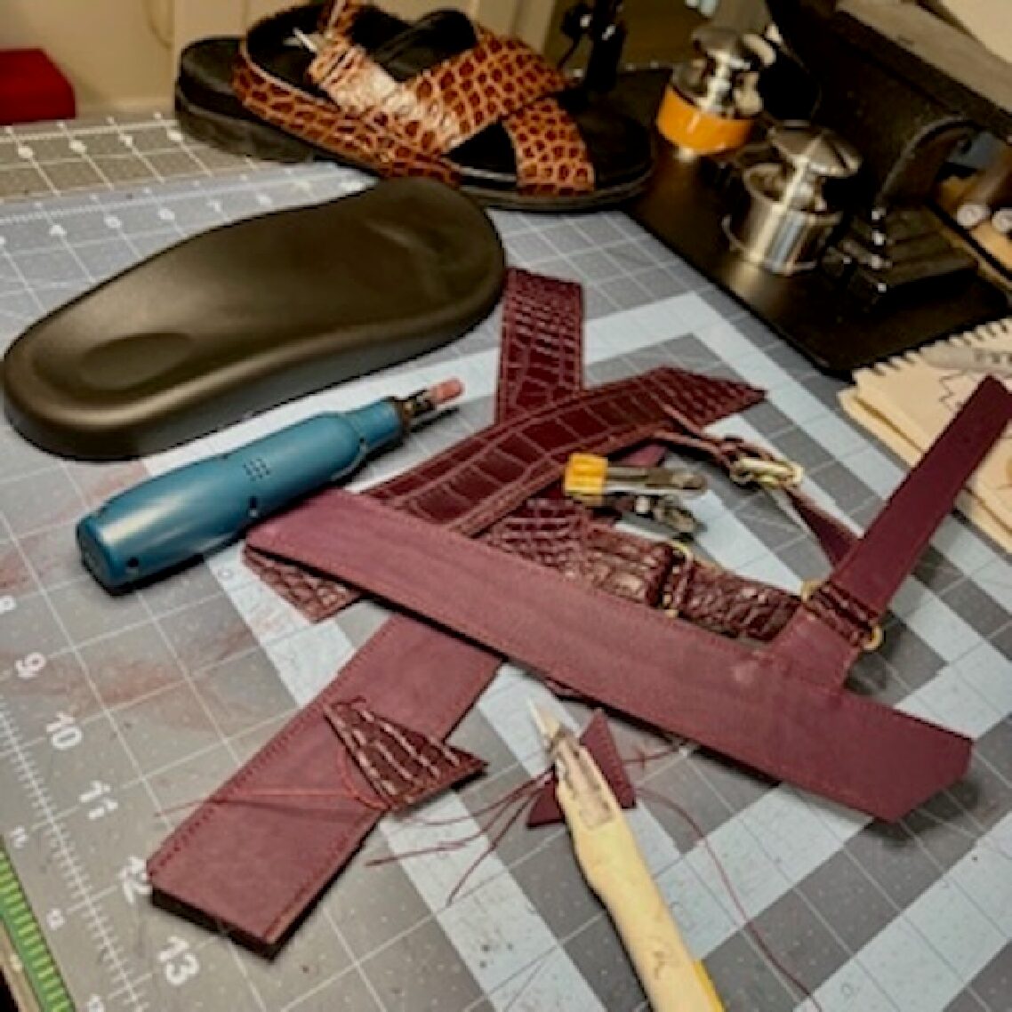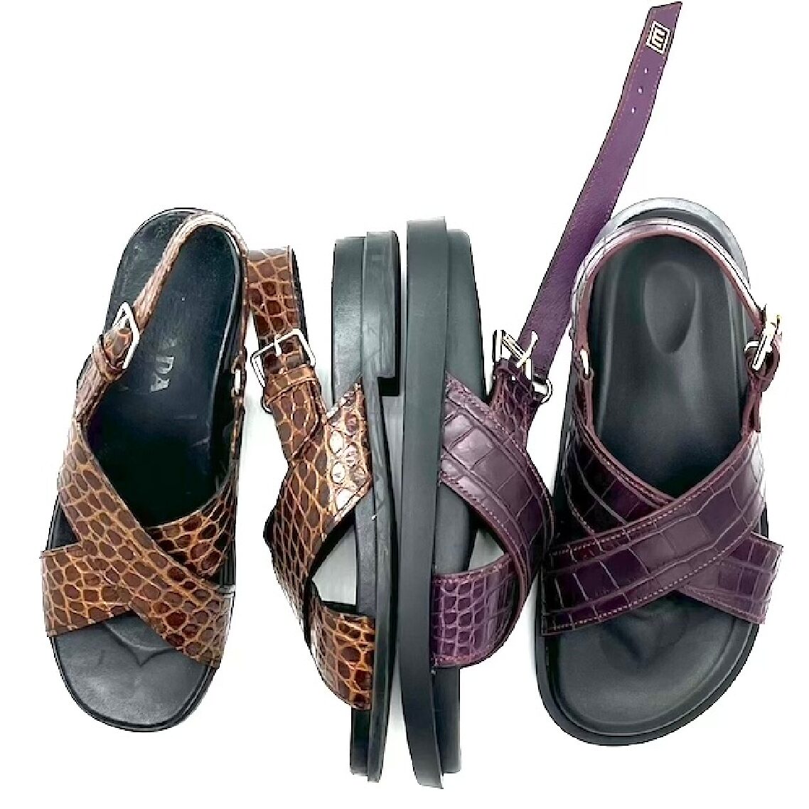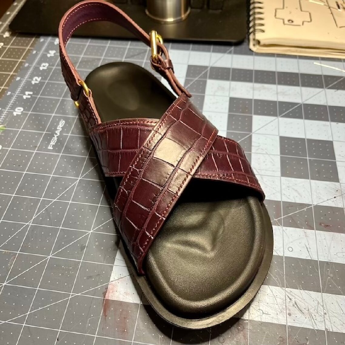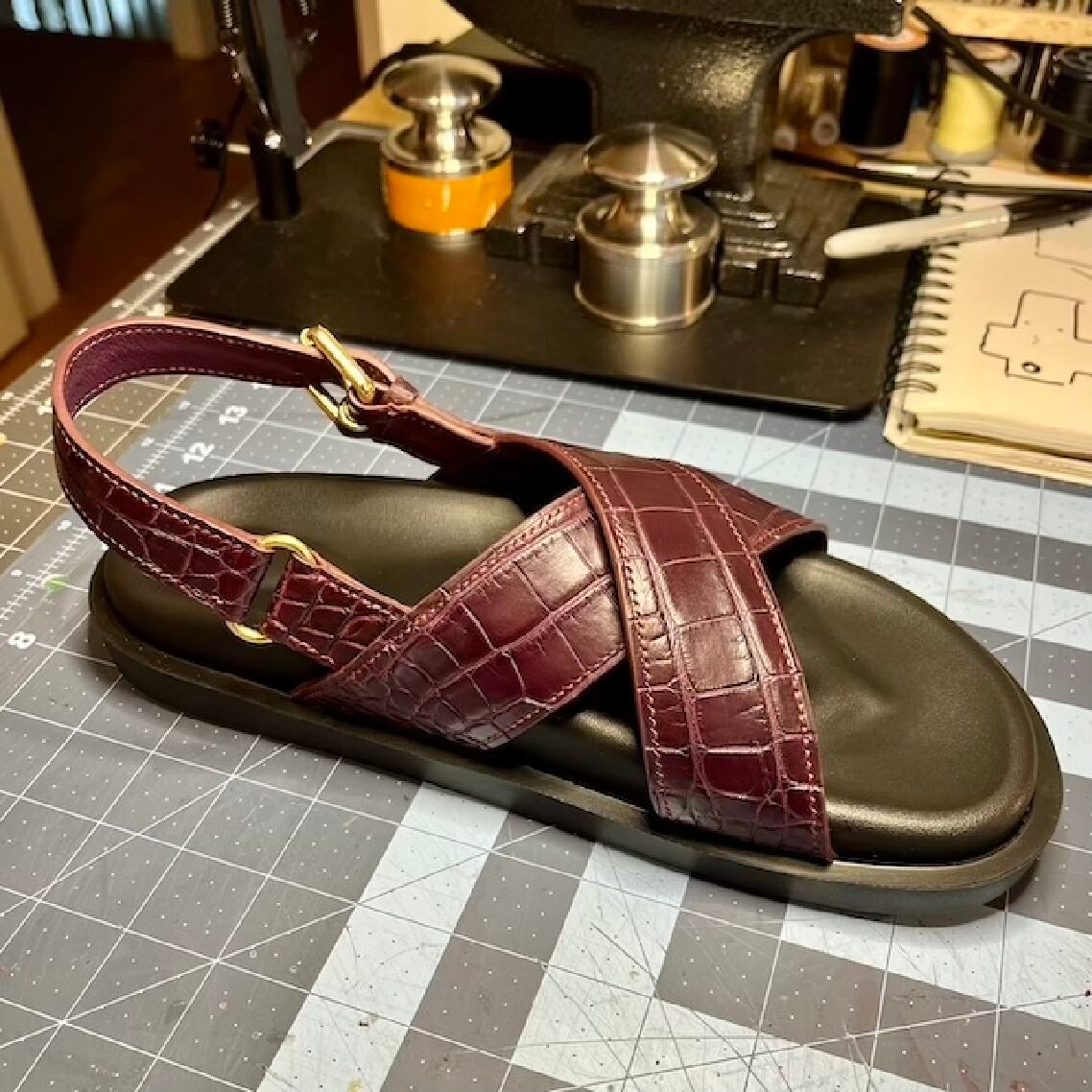 Made to order, birkenstock style, black rubber soles, inquire for leather hide types and colors after ordering. Inspired by a pair of Prada sandals. Handcut and handstitched with Mississippiensis Alligator (see notes) and lambskin leather.